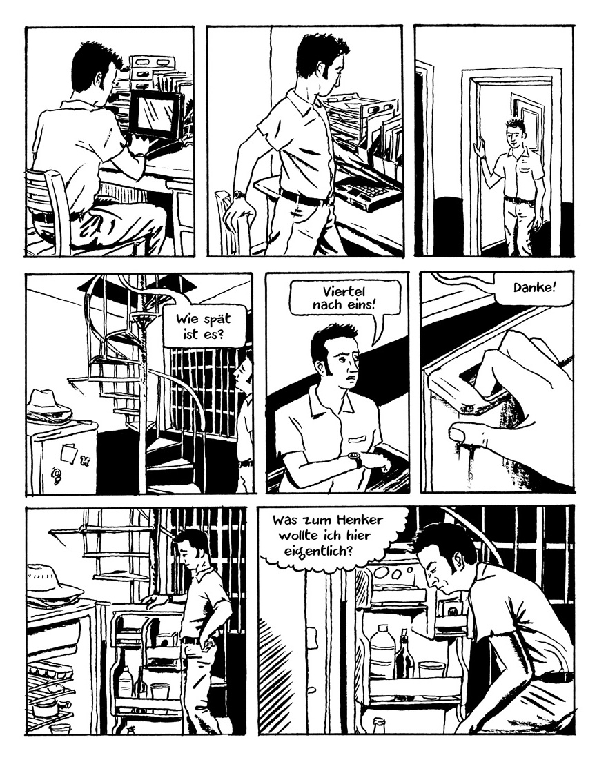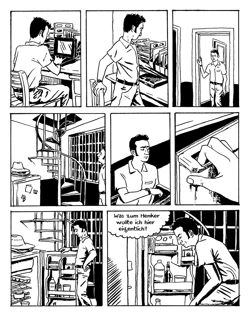 Mit der neunundneunzigsten Variation enden heute die Stilübungen. Kaum zu glauben, gefühlt startete die Serie erst vor ein oder zwei Wochen, aber nach den Veröffentlichungen Mittwochs und Samstags ist jetzt ein gutes Jahr herum, in dem die kurze Szene, in der Matt die Stufen herunterläuft und auf dem Weg vergisst, "was zum Henker" er am Kühlschrank eigentlich wollte, immer wieder neu dargestellt wurde: In verschiedenen Zeichenstilen, mit diversen Einschränkungen oder weiteren Kniffen zeigte Matt Madden spielerisch die Besonderheiten und Möglichkeiten des Comics. Es war mir eine Freude, "99 Ways to tell a Story – Exercises in Style" ins Deutsche übertragen zu dürfen.
